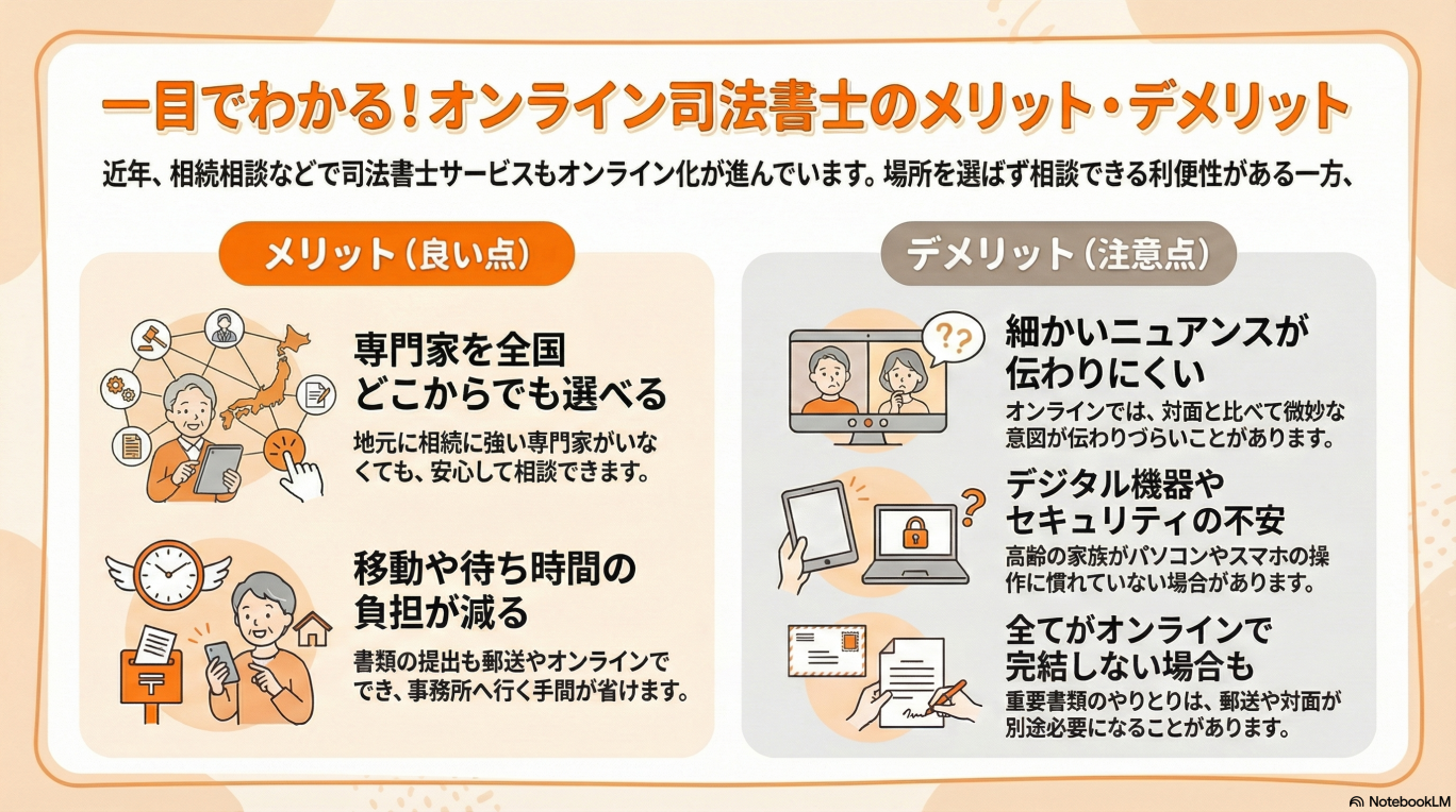 オンライン対応は、移動や待ち時間の負担軽減につながる大きなメリットがあります。ただし、細かなニュアンスやセキュリティ面で不安があれば、事前に進行方法をご確認ください。