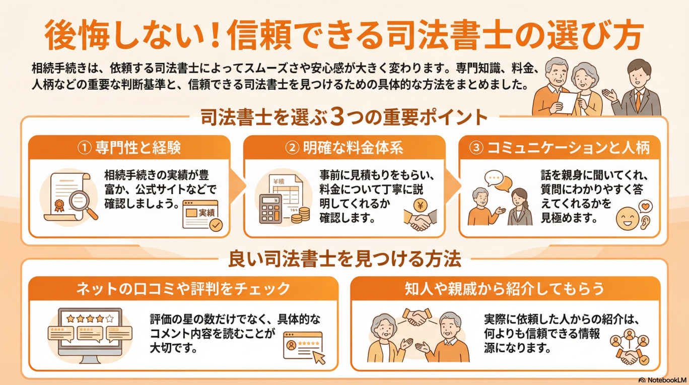 相続という大切な手続きを任せる相手として、司法書士の選定はとても重要です。