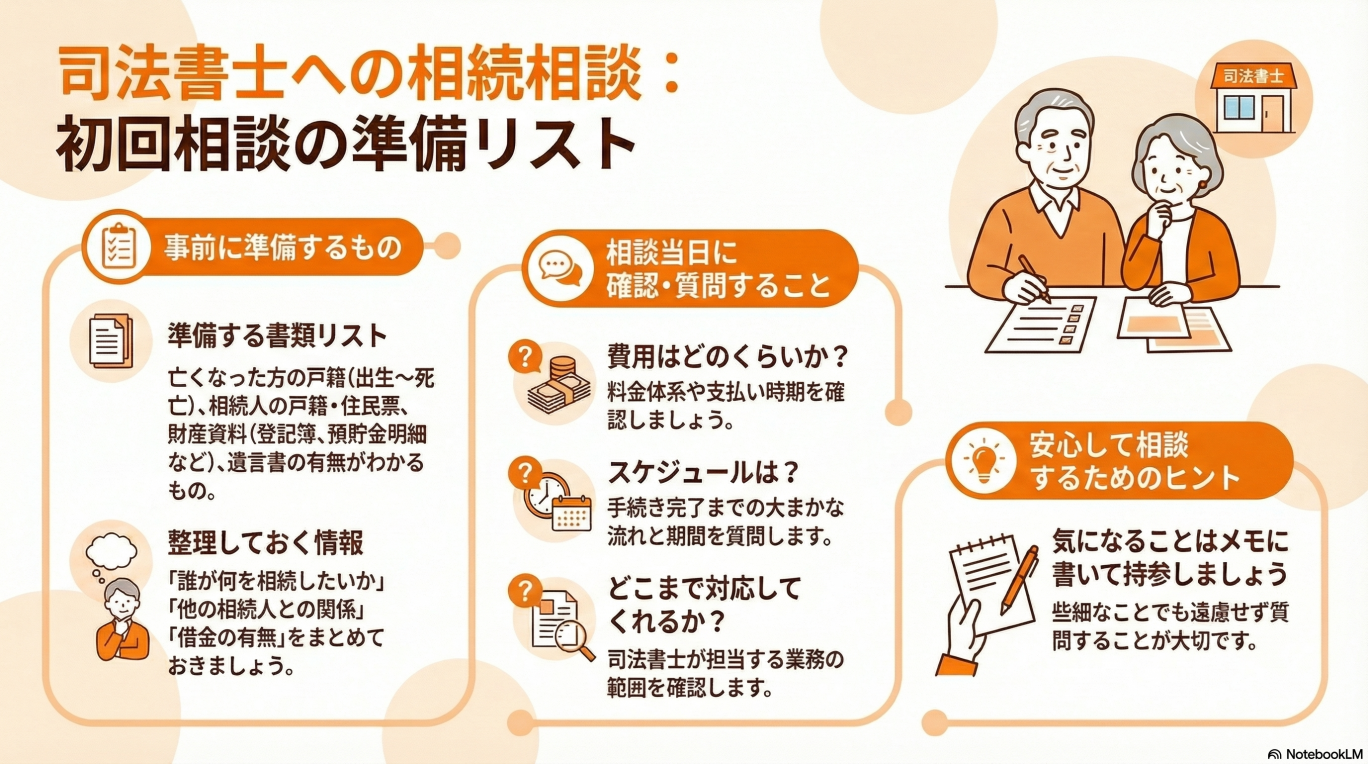 また、初回相談では「どの財産を誰が相続したいか」「他の相続人との関係はどうか」「借金の有無」なども聞かれるため、事前に整理しておくとスムーズです。加えて、相談の際には費用やスケジュール、司法書士の対応範囲についても質問することをおすすめします。