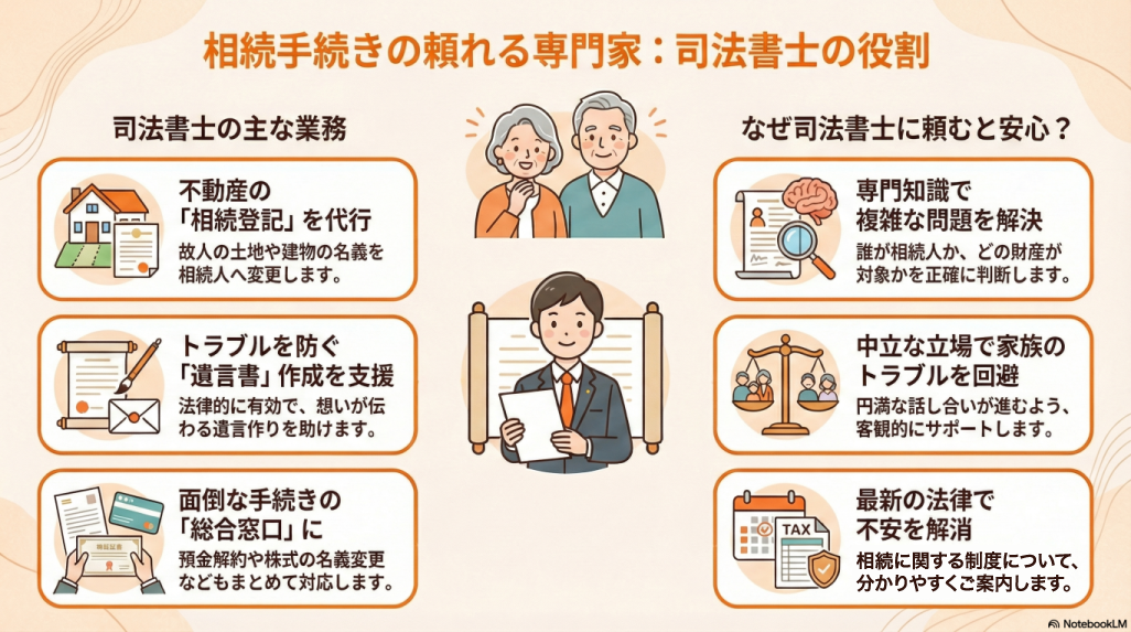 本記事では、相続における司法書士の役割から、実際の手続きの流れ、依頼するメリットと注意点、そして信頼できる司法書士の選び方までをわかりやすく解説します。