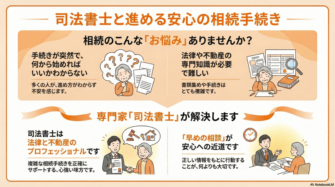 相続は一度きりの経験となることが多く、不安に感じるのは当然です。法律や不動産に精通した司法書士の存在が、心強い味方となります。