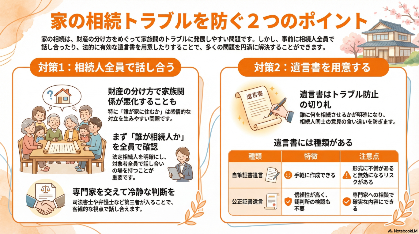 もう一つ、相続トラブルを防ぐ上で大きな鍵となるのが「遺言書の有無」です。遺言書が残されていれば、誰にどの財産を相続させるかが明確になるため、相続人同士の意見の食い違いを避けやすくなります。特に家のように高い価値を持つ不動産では、遺言の有無が相続の進行に大きく影響します。