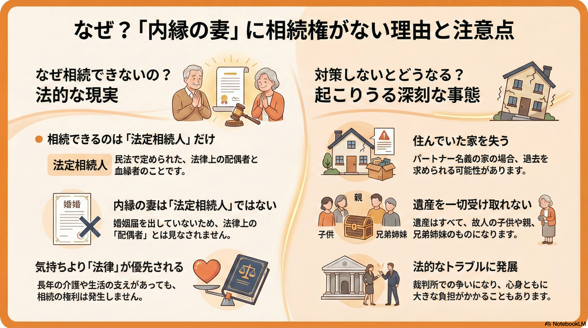 このように、内縁の妻が相続権を持たないという事実は、亡くなった後の生活に直接影響を及ぼします。