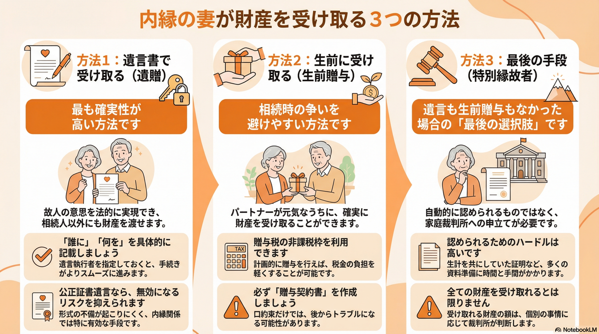 遺言書や生前贈与、特別縁故者としての申立てなど、状況に応じた方法を知っておくことで、内縁の妻でも財産を受け取れる可能性があります。