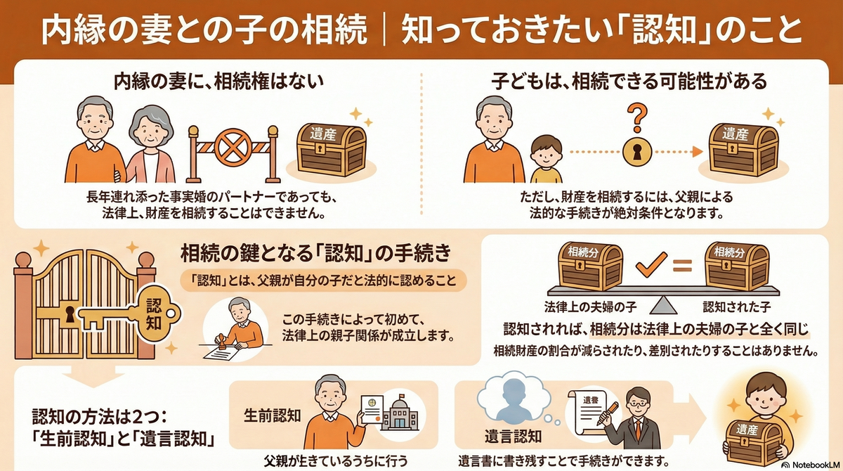 内縁の妻との間に生まれた子どもであっても、父親に認知されていれば法定相続人となり、相続分は嫡出子と同じです。認知がされていない場合は相続権が発生しないため、早めに手続きを行うことが重要です。