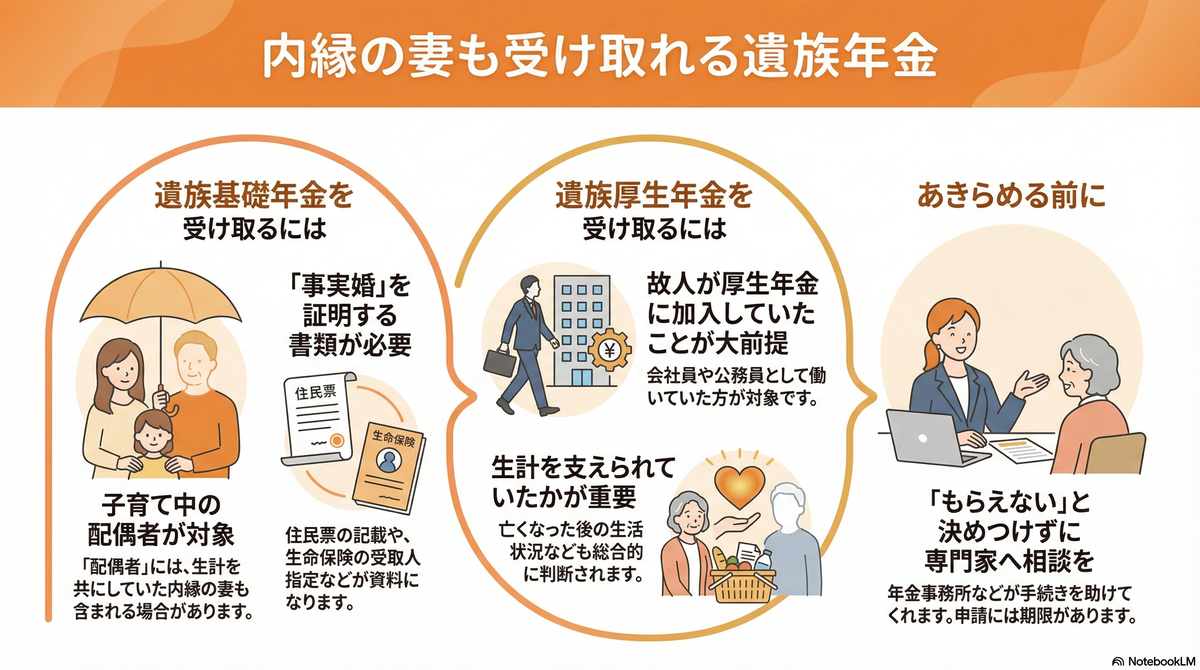 条件を満たせば、内縁の妻でも遺族基礎年金や遺族厚生年金を受け取れる可能性があります。