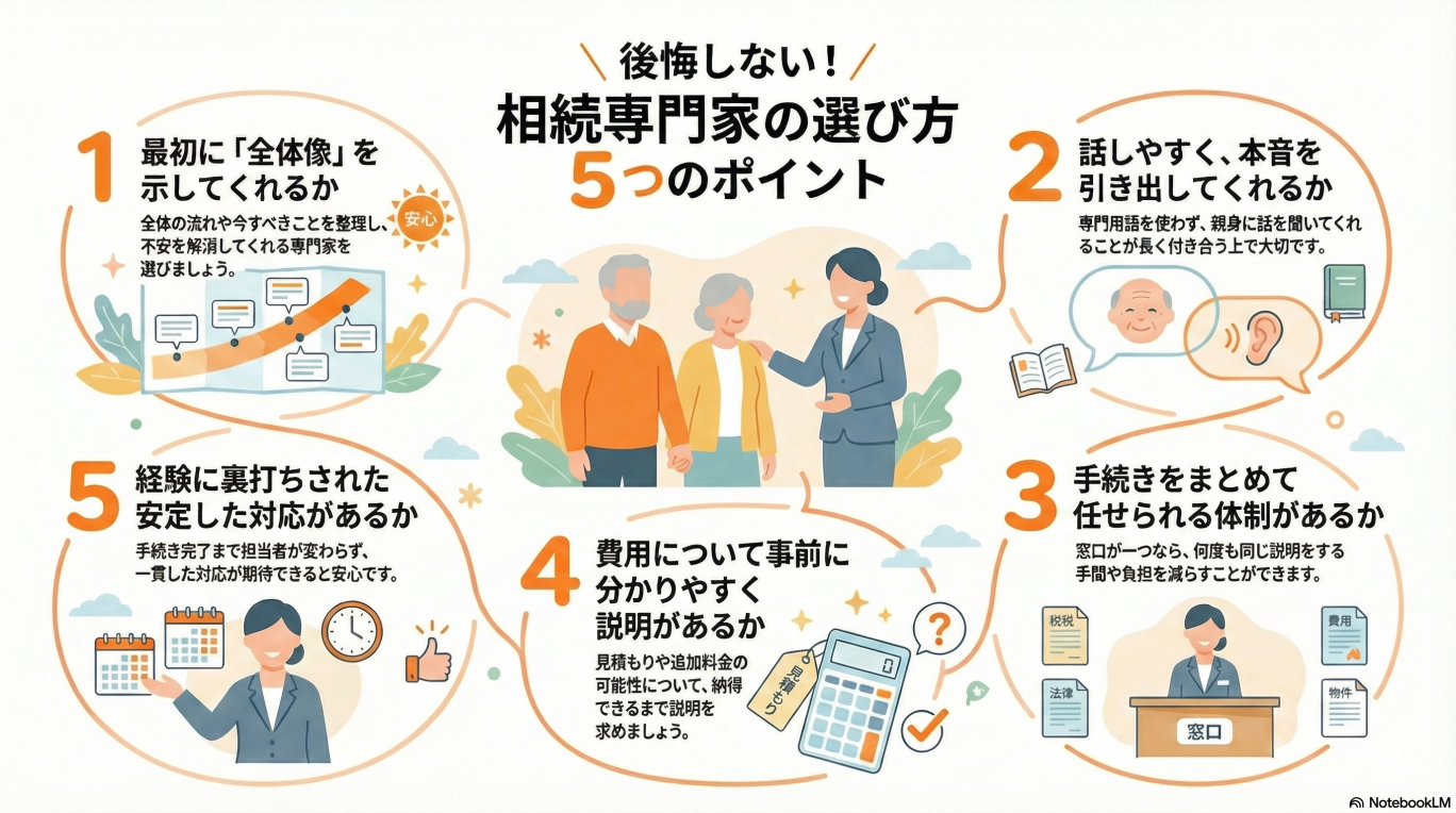 相続の相談先は「どこも同じ」に見えますが、実際は大きな差があります。安心して任せられる専門家を見極めるために、次の5つを意識して選ぶことが大切です。