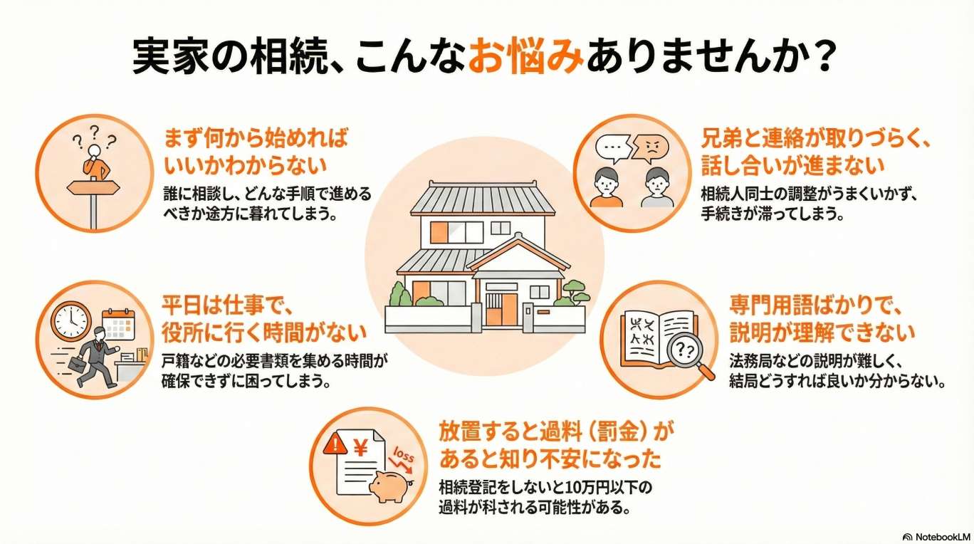 特に当別町内に不動産がある場合、兄弟との連絡調整や役所への書類請求など、慣れない作業が多く、手続きが止まってしまうケースも少なくありません。