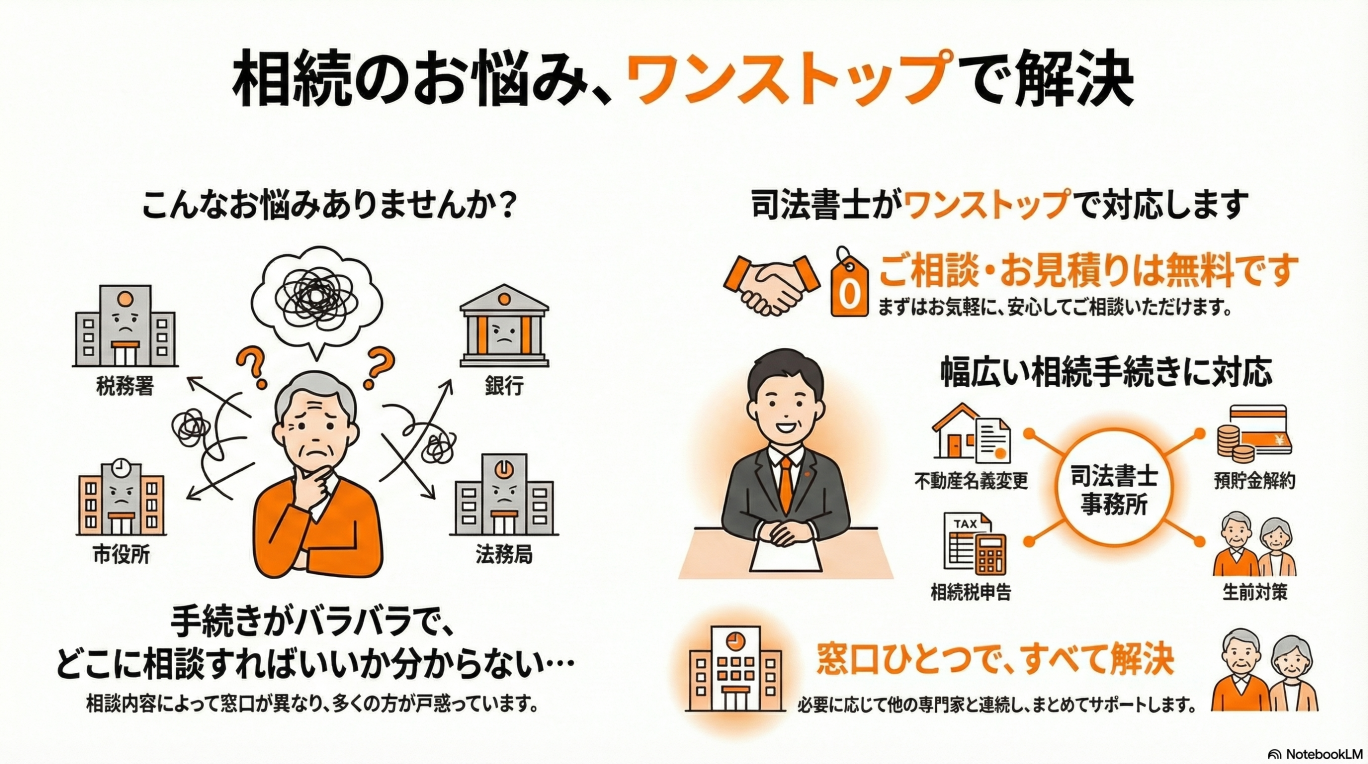 ただし、書類の取得や一般的な案内は可能ですが、登記手続きの代理申請や相続人間の調整、遺産分割に関する具体的なサポートは行っていないため、専門家への相談をおすすめします。