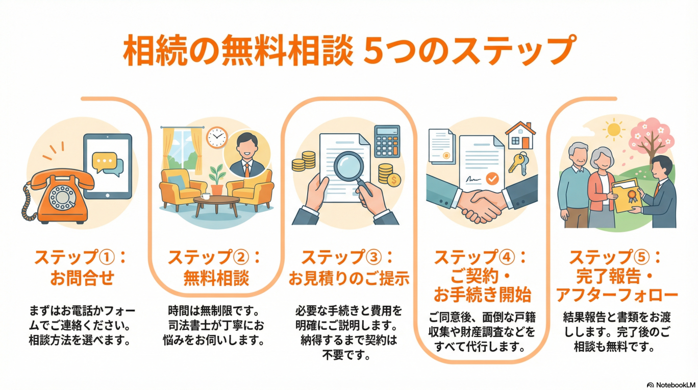 初回相談は無料。オンラインや郵送にも対応しているため、遠方の相続やご多忙な方でも安心してご相談いただけます。