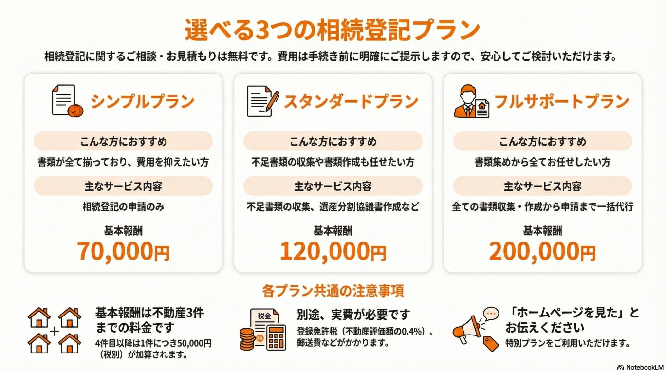 ・書類不足や遺産分割協議書に不備があり、相続登記に適さない書類を準備された場合は本プランの利用不可