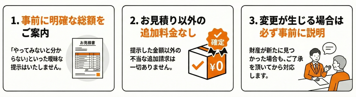 ご相談時に必ず総額のお見積もりを提示し、ご納得いただいた上で業務を開始いたします。